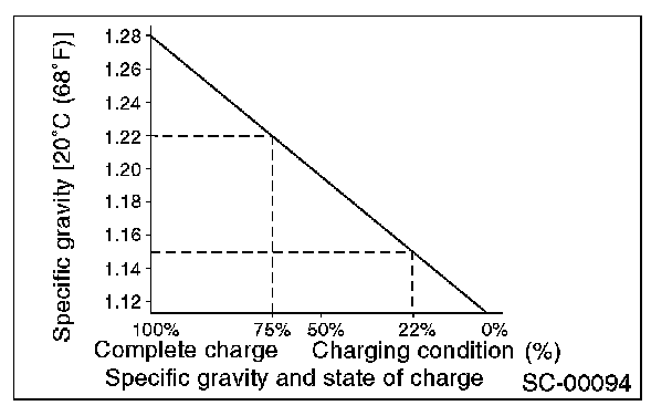 1. Measure the specific gravity of electrolyte using a hydrometer and a thermometer. Specific gravity varies with temperature of electrolyte so that it must be corrected at 20 °C (68 °F) using the following equation: