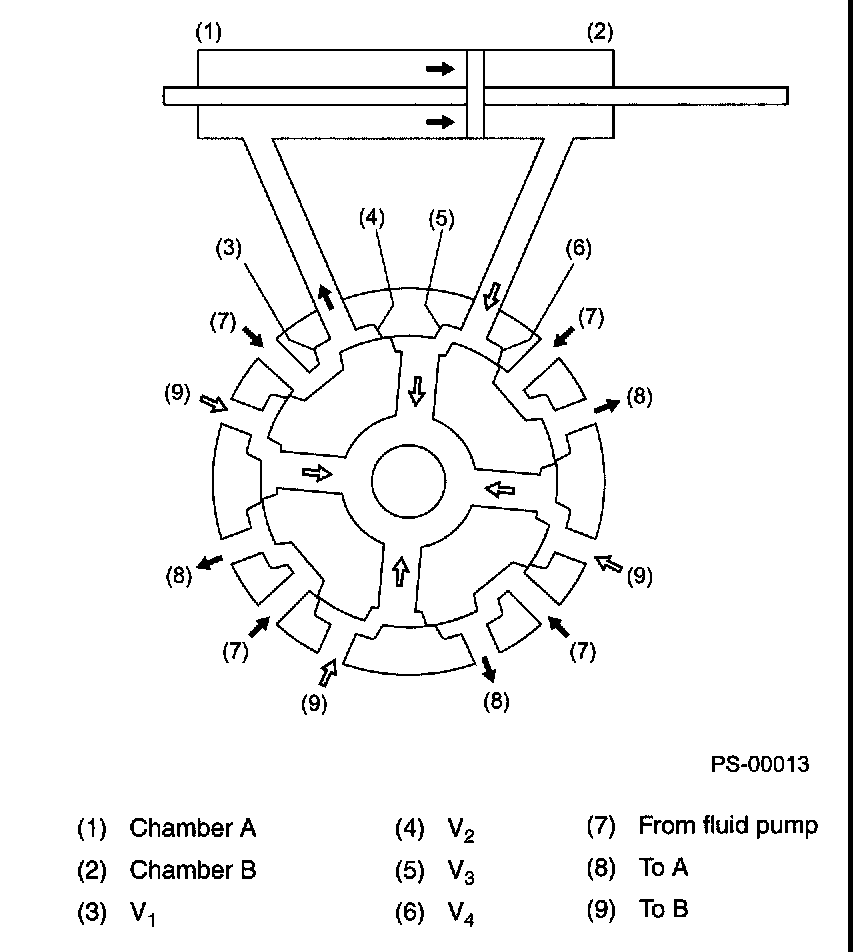 When the steering wheel is turned to the right, for example, fluid passages V1 and V3 are opened while fluid passages V2 and V4 are nearly closed.