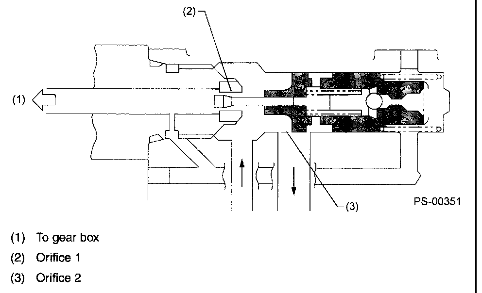 The flow control valve regulates flow rate of fluid which otherwise would increase as pump speed increases and deliver dangerously high pressure to the gearbox. It consists of orifices 1 and 2, valve spool, return port and flow control spring. When a pressure difference occurs between the front and rear of orifice 2 as a result of an increase in discharge rate, the valve spool moves against the tension of the flow control spring in such a way that the oil flow rate is controlled by opening and closing of the return port and orifice 2.