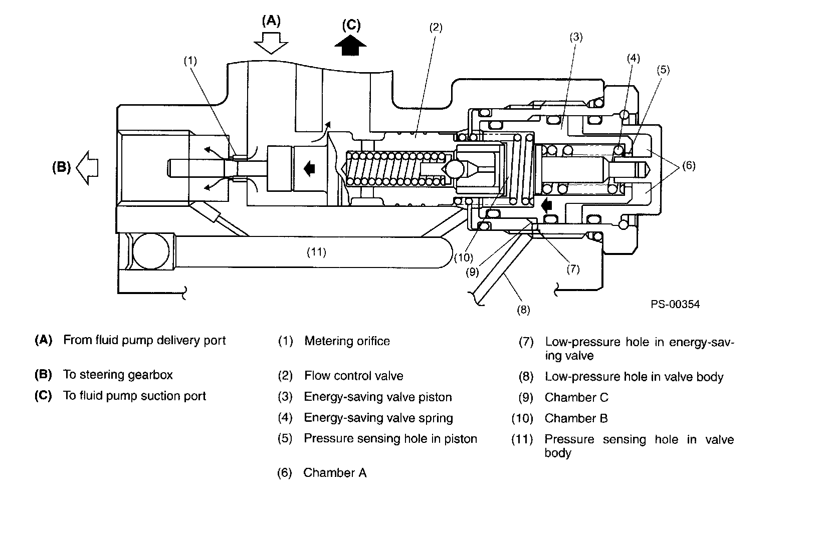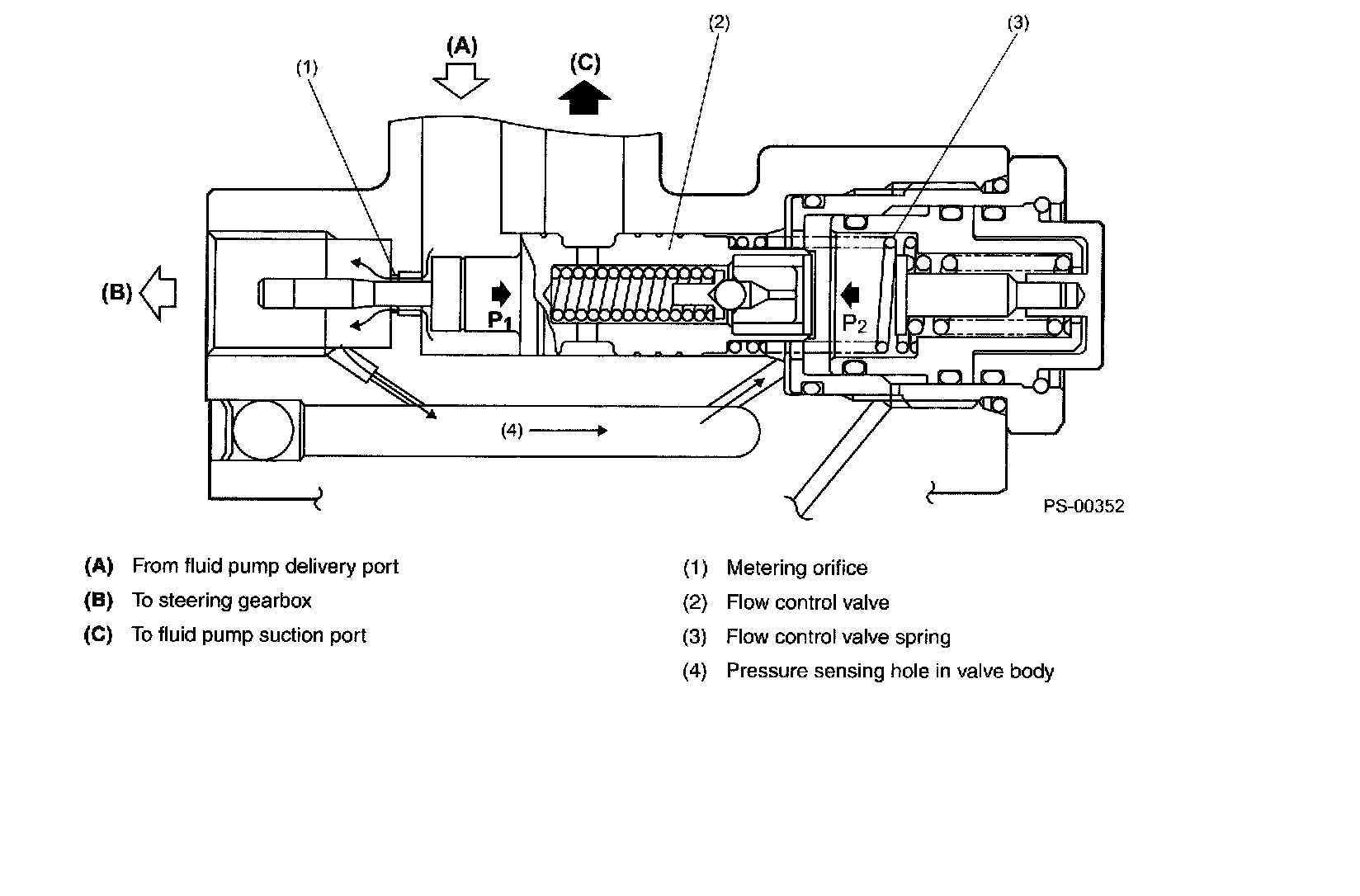 When the engine is idling, the fluid pump speed is low. As the delivery rate of the pump is small, the metering orifice allows whole fluid to flow passing through it. So, there is no difference in the fluid pressure between the right and left of the metering orifice. This means that pressure P1 acting on the left end of the flow control valve is equal to pressure P2 (pressure of the fluid flowing through the pressure sensing holes in the valve body) acting on the right end of the valve. As a result, the flow control valve is held pressed leftward by the force of the control valve spring. With the flow control valve in this position, the passage to the fluid pump suction port is closed, so that the whole fluid delivered from the pump flows toward the power steering gear box.