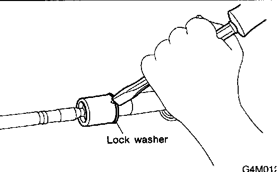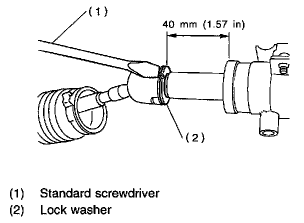 7. Extend the rack approximately 40 mm (1.57 inch) out. Unlock the lock wire at lock washer on each side of tie-rod end using a standard screwdriver.