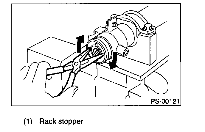 14. Using a sharp pointed pliers, rotate the rack stopper in the direction of the arrow until the end of the circlip comes out of the stopper. Rotate the circlip in the opposite direction and pull it out.