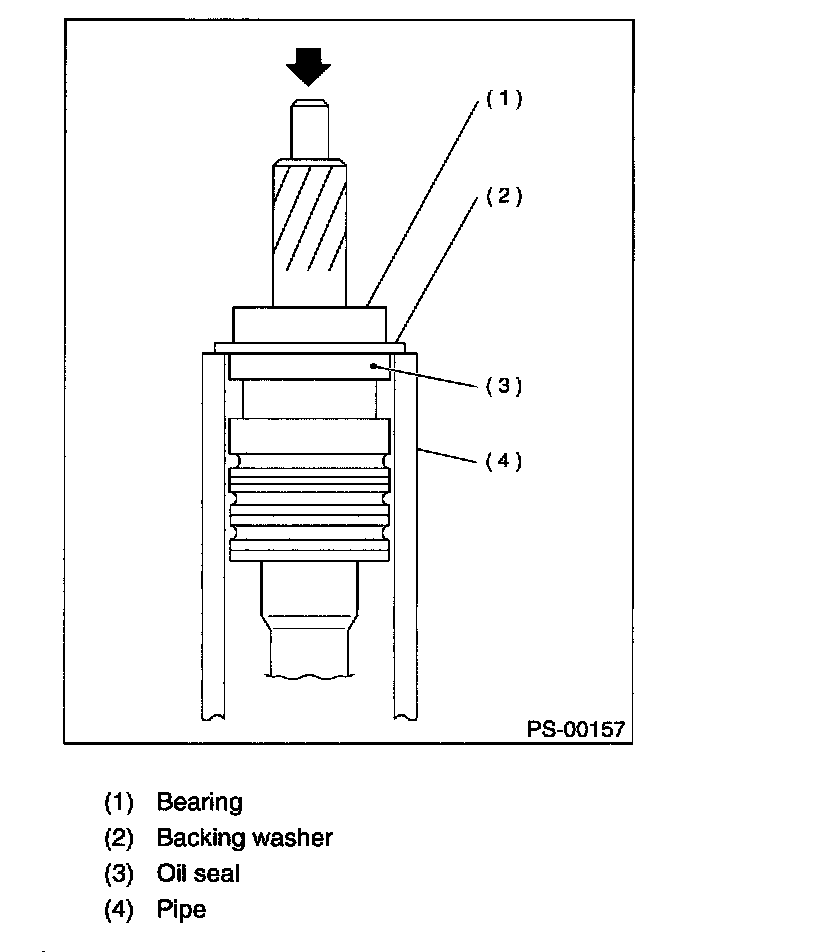 12. Press out the bearing together with the back up washer using pipe of I.D. 38.5 to 39.5 mm (1.51 6 to 1.555 inch) and press.