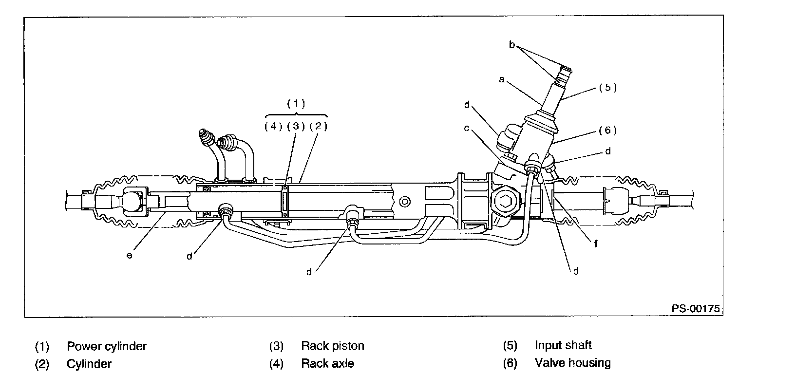 6. If leak is other than a, b, c, or d, and if oil is leaking from the gearbox, move the right and left boots toward tie-rod end side, respectively, with the gearbox mounted to the vehicle, and remove oil from the surrounding portions. Then, turn the steering wheel from lock to lock 30 to 40 times with the engine running, then make comparison of the leaked portion immediately after and several hours after this operation.