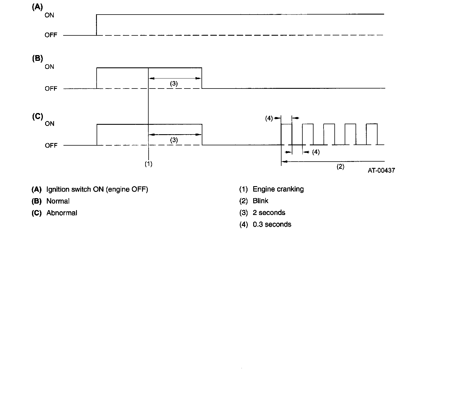 On starting the engine, the AT OIL TEMP warning light illuminates and then goes out as shown in the "Normal" diagram below. If any problem exists, the light continues flashing as shown in the "Abnormal" diagram below.