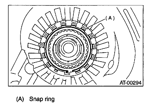 6) Installation of the low & reverse brake: Install dish plate, driven plates, drive plates, and a retaining plate, and secure with a snap ring.