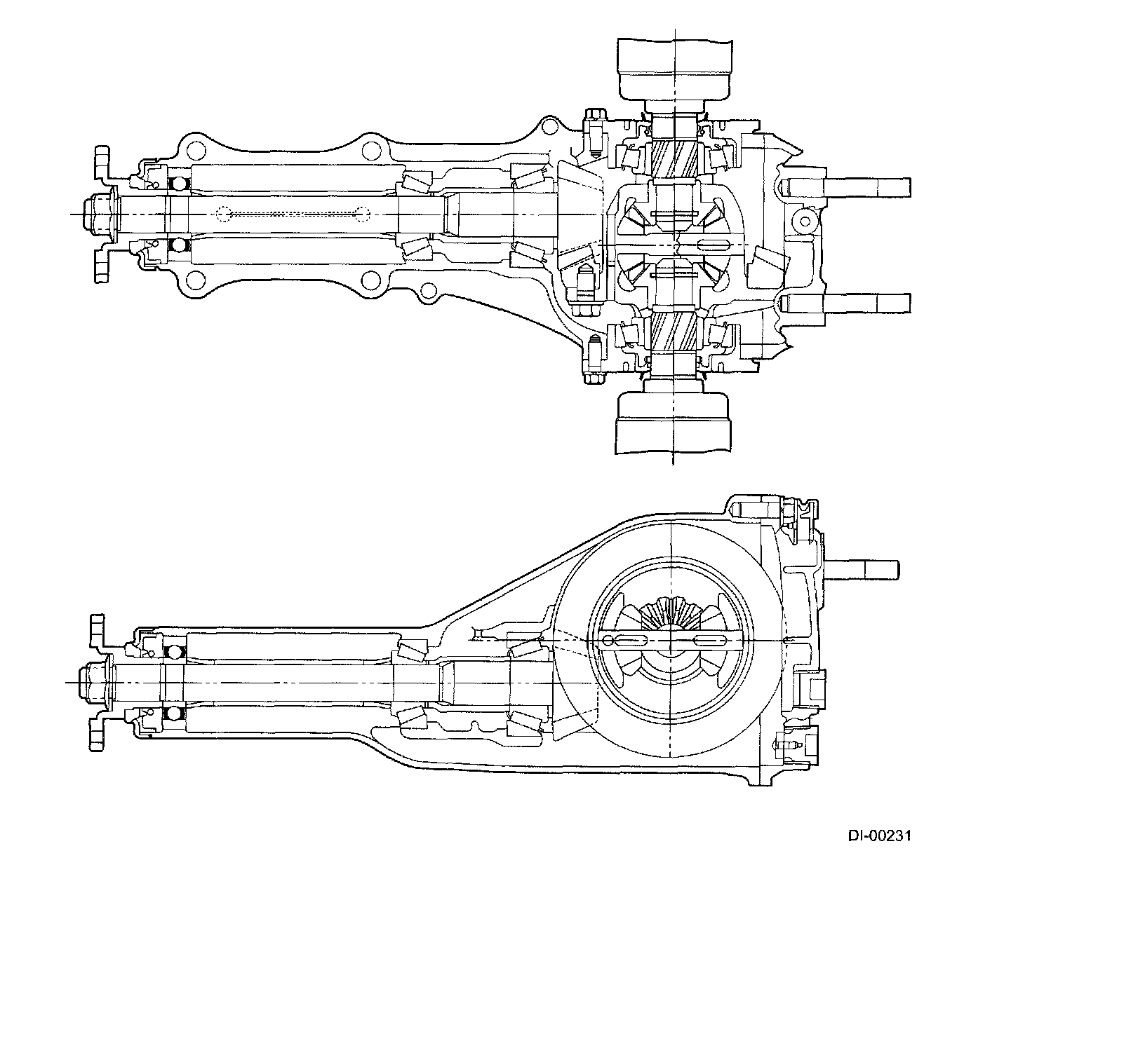 The drive gear is a hypoid gear with nominal diameter of 180 mm (7.09 in). The drive pinion shaft is supported by three bearings. The bearing preload is adjusted by selecting a spacer and washer combination of a proper thickness. The drive pinion height is adjusted by properly selecting the thickness of the washers located at the drive pinion neck based on the value stamped on the drive pinion shaft rear end.