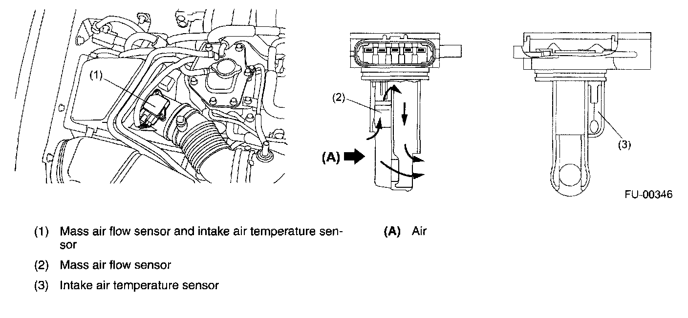MASS AIR FLOW SENSOR AND INTAKE AIR TEMPERATURE SENSORThe mass air flow and the intake air temperature sensors are integrated into a single unit. The unit is mounted on the air cleaner case and measures the amount as well as the temperature of the intake air.
