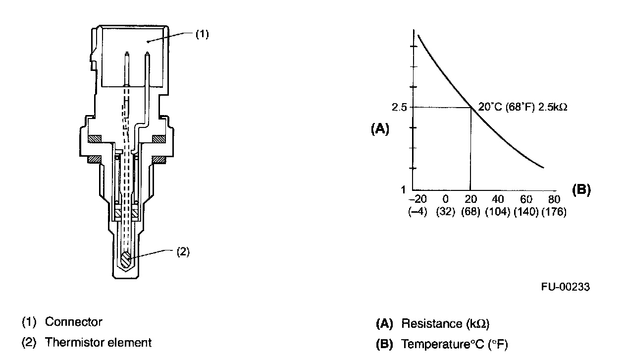 ENGINE COOLANT TEMPERATURE SENSORThe engine coolant temperature sensor is located on the engine coolant pipe. The sensor uses a thermistor whose resistance changes inversely with temperature. Resistance signals as engine coolant temperature information are transmitted to the ECM to make fuel injection, ignition timing, purge control solenoid valve and other controls.