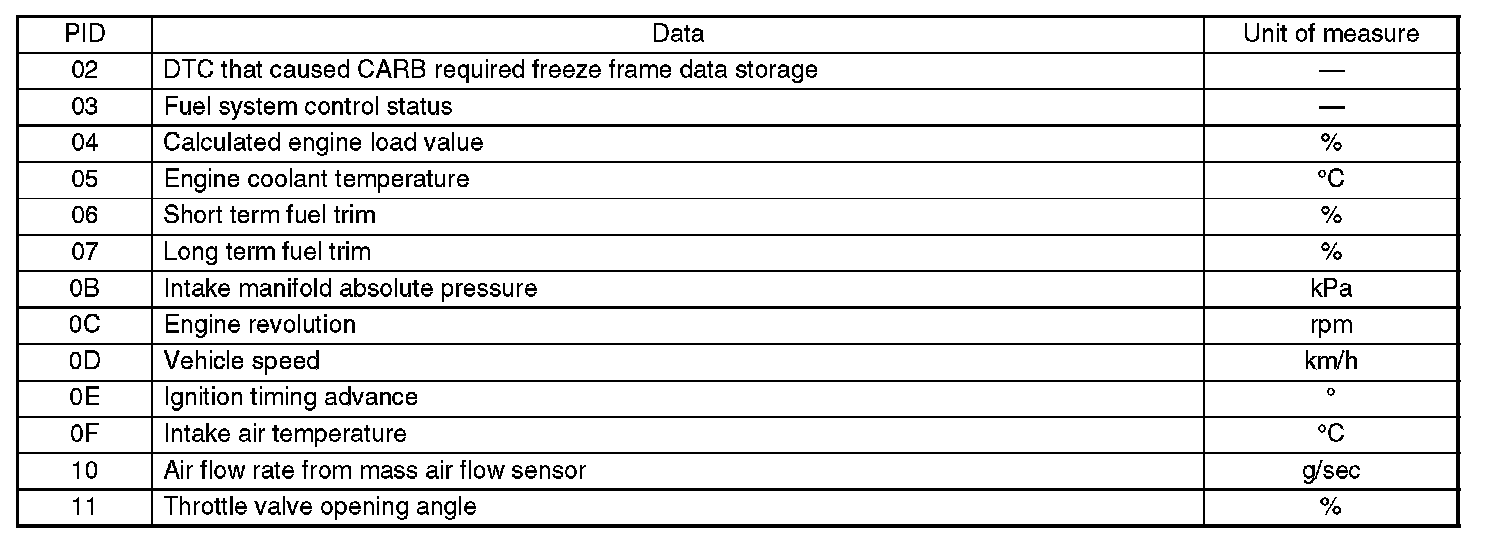 Refers to data denoting the operating condition when trouble is sensed by the on-board diagnosis system. A list of the support data and PID (Parameter Identification) codes are shown in the table.