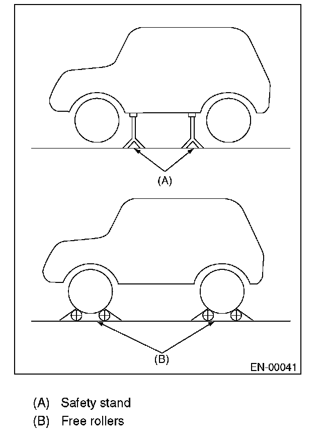 - In order to prevent the vehicle from slipping due to vibration, do not place any wooden blocks or similar items between the safety stands and the vehicle.