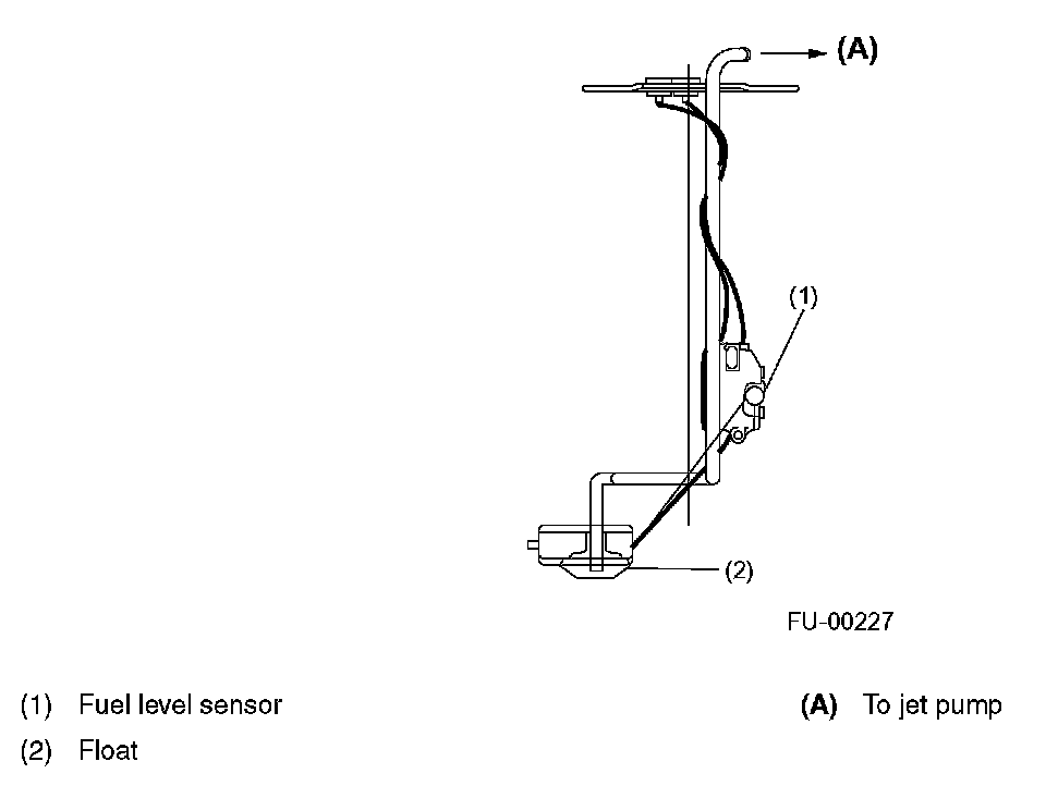 SUB-COMPARTMENT FUEL LEVEL SENSORThis sensor detects the level of the fuel in the sub-compartment (the compartment in which the fuel pump is not located) and acts as part of the fuel transfer line when the jet pump is in operation to maintain the fuel in both compartments at the same level.