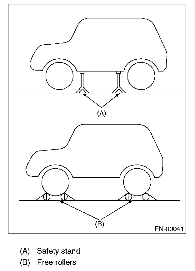 - In order to prevent the vehicle from slipping due to vibration, do not place any wooden blocks or similar items between the safety stands and the vehicle.