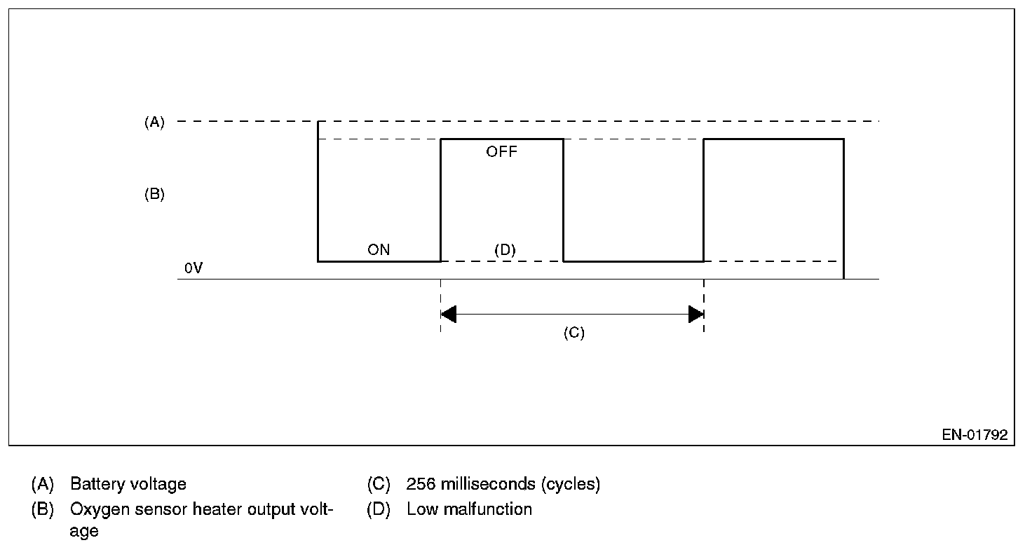 Oxygen sensor heater conducted the duty control, and the output terminal voltage at ON is 0 V and the output terminal voltage at OFF is the battery voltage.