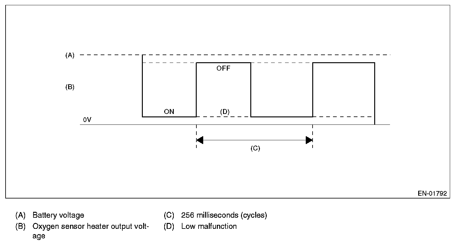 Oxygen sensor heater conducted the duty control, and the output terminal voltage at ON is 0 V and the output terminal voltage at OFF is the battery voltage.