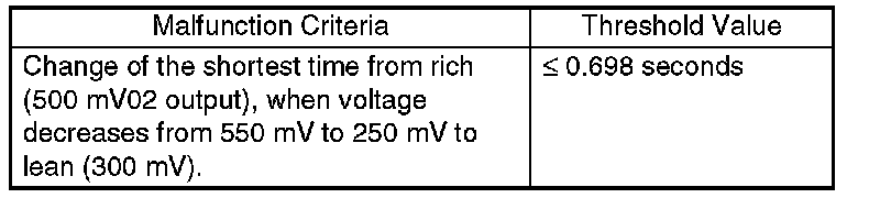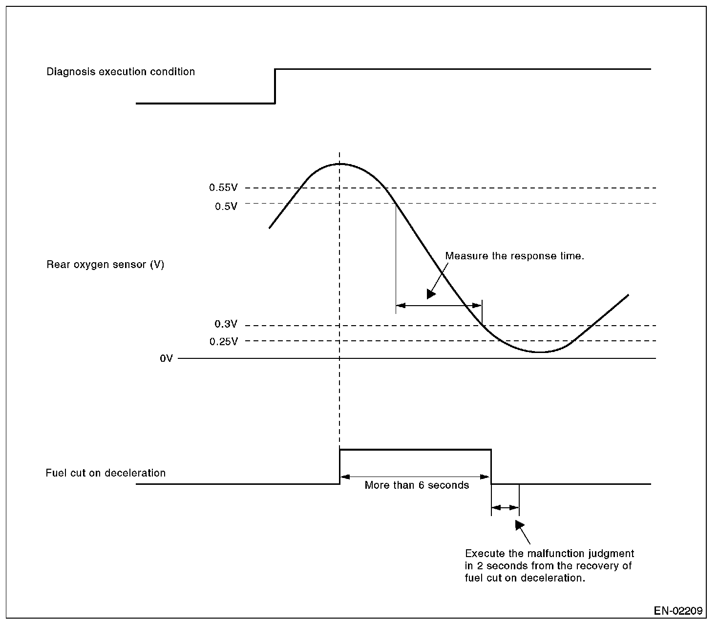 NOTE: Variation time of rear oxygen sensor output voltage is short during fuel shut-off in deceleration. Carry out the NG judgment only after the fuel shut-off in deceleration. As for OK judgment, without the condition of fuel shut-off in deceleration, judge OK if the value is below the threshold value.
