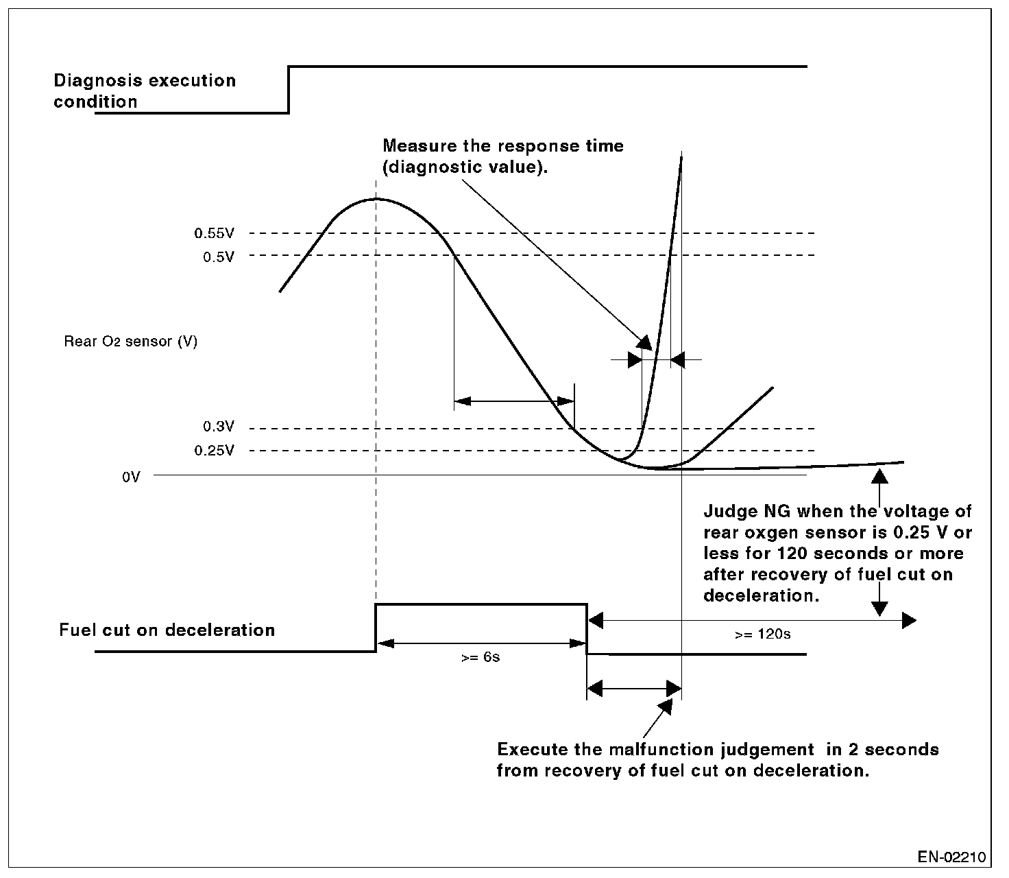 2. Judge NG when the O2 sensor voltage after recovery of fuel shut-off in deceleration is large. Judge NG when fuel shut-off in deceleration is also long (6s or more), and although carried out the fuel shut-off in deceleration cut return, when O2 sensor voltage is large (more than 0.55V).