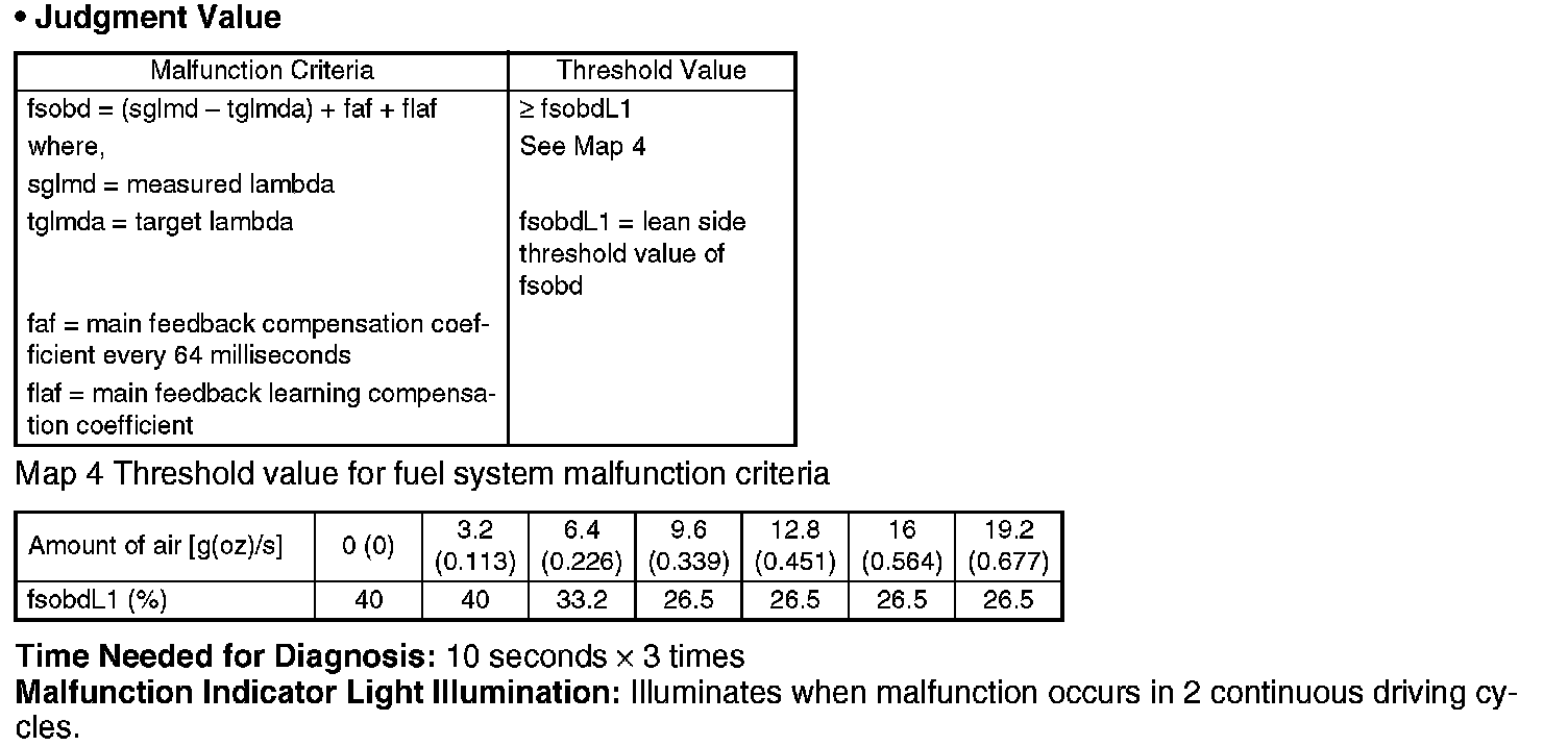 Judge that the fuel system malfunction occurs when the time during completing the malfunction criteria continues 30 seconds or more by comparing the diagnosed value (fsobd) with threshold value.