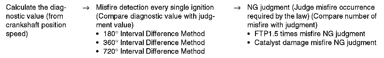 Detect whether the misfire occurred or not. (Revolution fluctuation method) Monitoring the misfire which influences exhaust deterioration (1.5 times of FTP) and catalyst damage is made obligatory by the law. Misfire affecting these two has three patterns below.