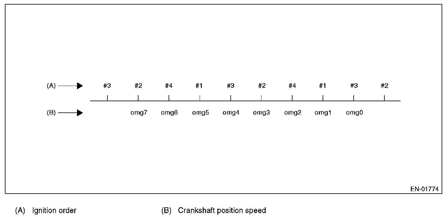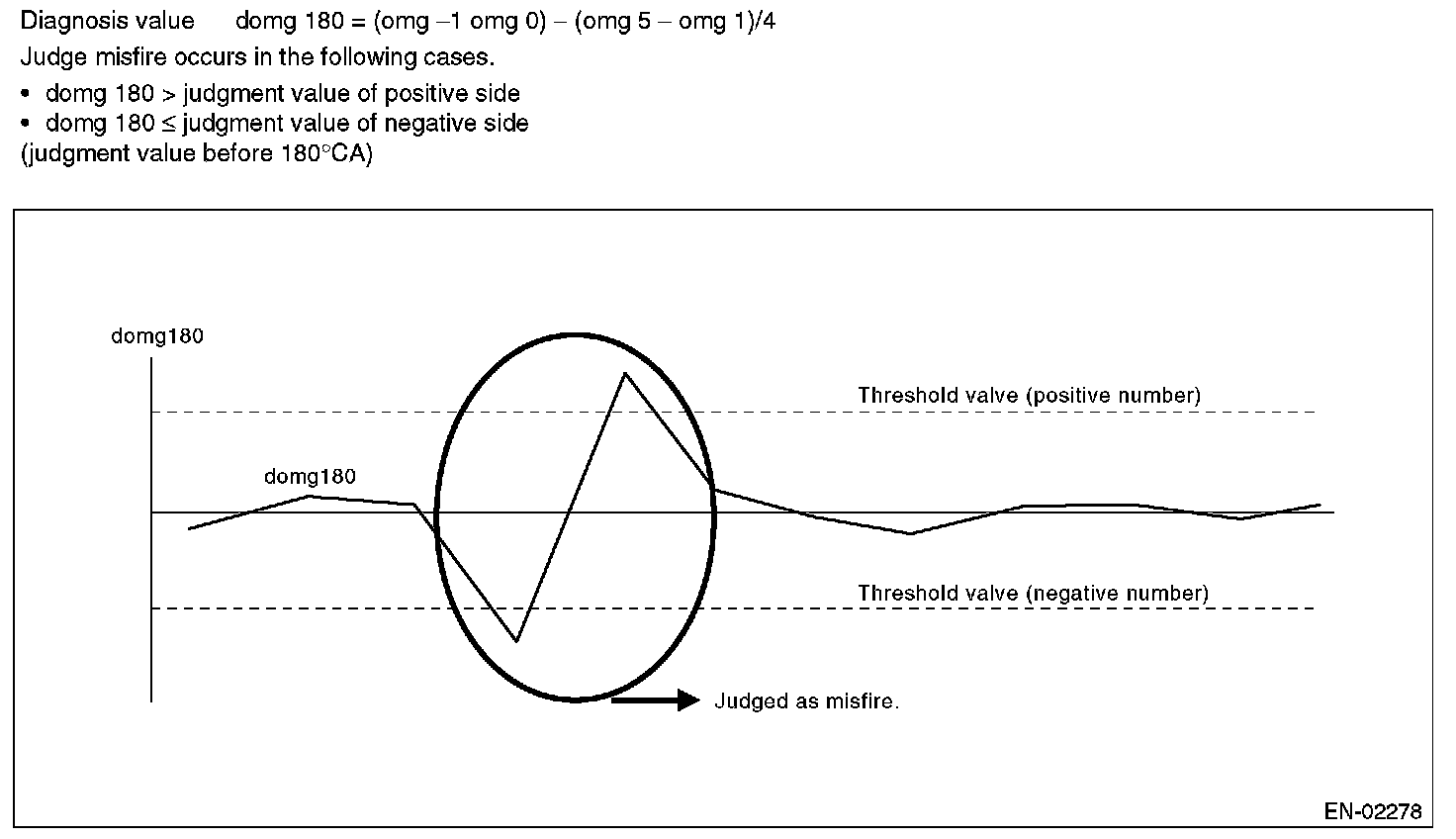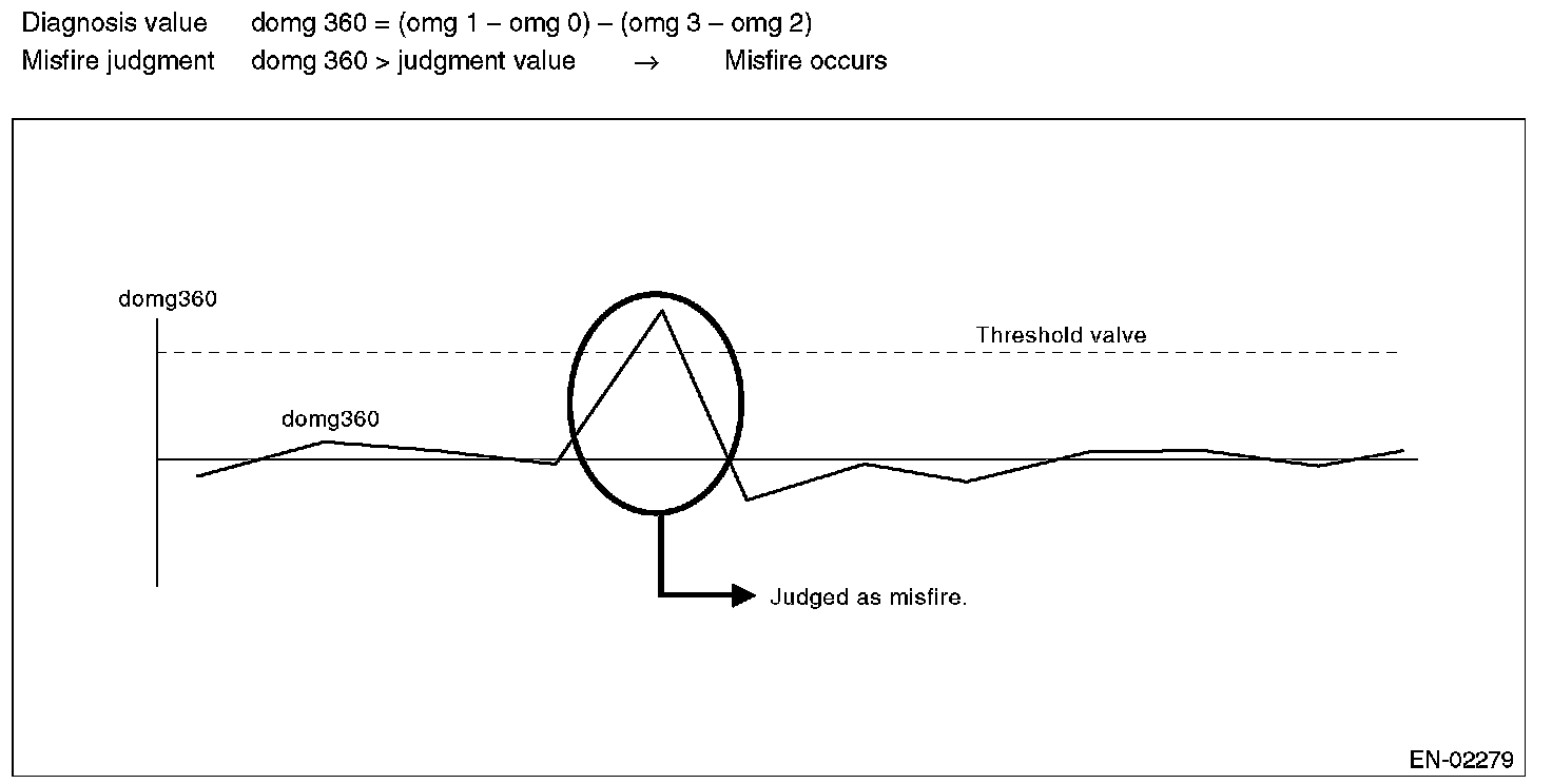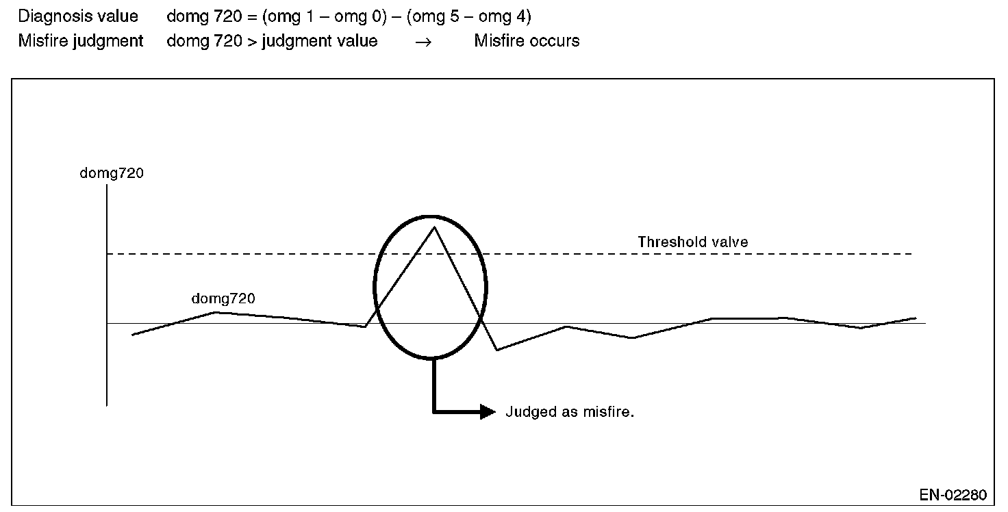 When the misfire occurred, the engine speed is decreased and the crankshaft position speed will change. Calculate the interval difference value (diagnostic value) from crankshaft position speed by the following formula, and judge whether the misfire occurs or not comparing the calculated result with judgment value. Counting the number of misfire up, and if the misfire ratio is higher during 1000 rev. or 200 rev., judge NG for the corresponding cylinder.