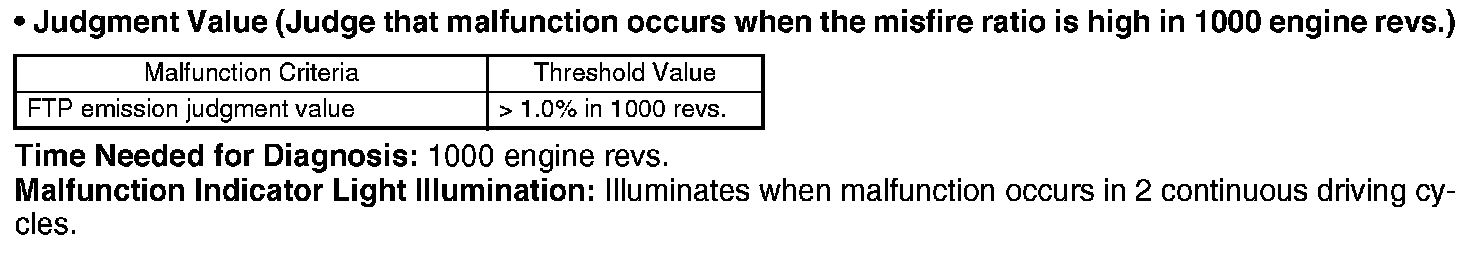 - Intermittent misfire (The same cylinder misfires in random, or different cylinders misfire in random.): FTP 1.5 times misfire