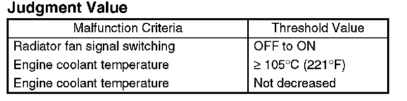 Check the engine coolant temperature (A/D value) when the radiator fan is ON since the radiator fan output turns from OFF to ON with all of the malfunction conditions completed.