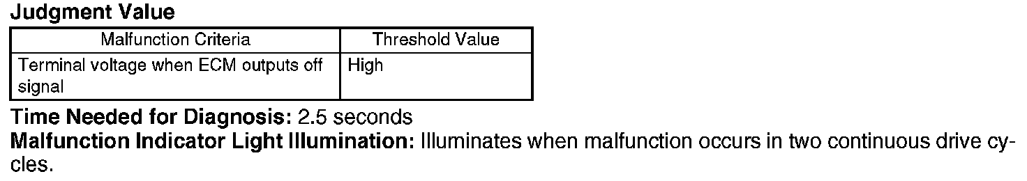 Judge NG when the continuous time of completing the malfunction criteria becomes more than time needed for diagnosis (2.5 seconds). Judge OK and clear the NG when the malfunction criteria are not completed.