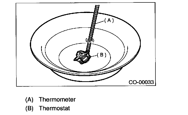 Immerse the thermostat and a thermometer in water. Raise water temperature gradually, and measure the temperature and valve lift when the valve begins to open and when the valve is fully opened. During the test, agitate the water for even temperature distribution. If the measured temperature is within the specified range, the condition of thermostat is normal.