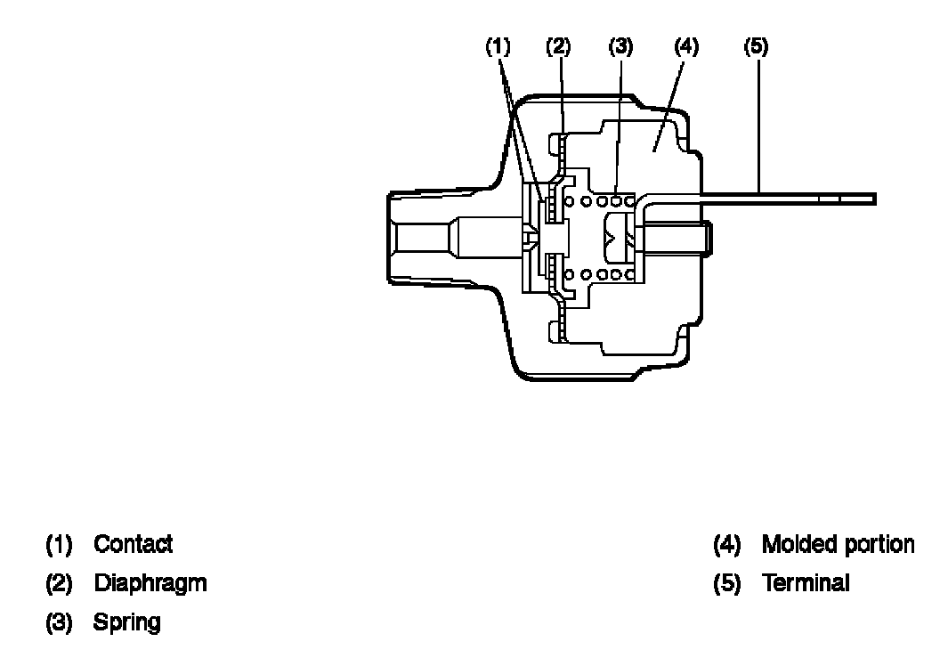 After reaching the specified value of 14.7 kPa (0.15 kgf-cm, 2.1 psi), the oil pressure pushes the diaphragm overcoming the spring force. This opens the contact points and the oil pressure warning light goes out.