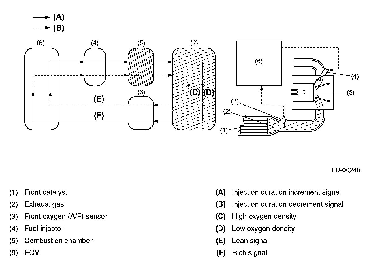 - In the air-fuel ratio feedback control, the ECM calculates the necessary amount of correction based on data from the oxygen sensor and adds the result to the basic duration (which is stored in the ECM's memory for each condition defined by the engine speed and various loads.)