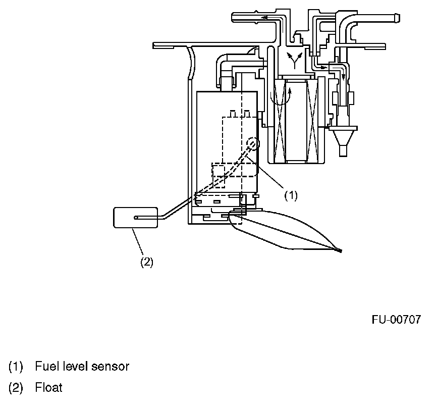 FUEL LEVEL SENSORThe fuel level sensor is integrated with the fuel pump which is located in the fuel tank. The sensor outputs an electric resistance signal that varies with movement of its float to indicate the level of the fuel remaining in the tank.