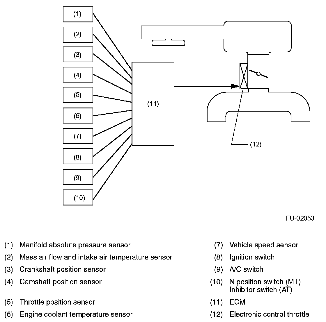 IDLE AIR CONTROL- The ECM controls the electronic control throttle based on signals from the crankshaft position sensor, engine coolant temperature sensor, manifold absolute pressure sensor and A/C switch so that the proper idle speed for each engine load is achieved.