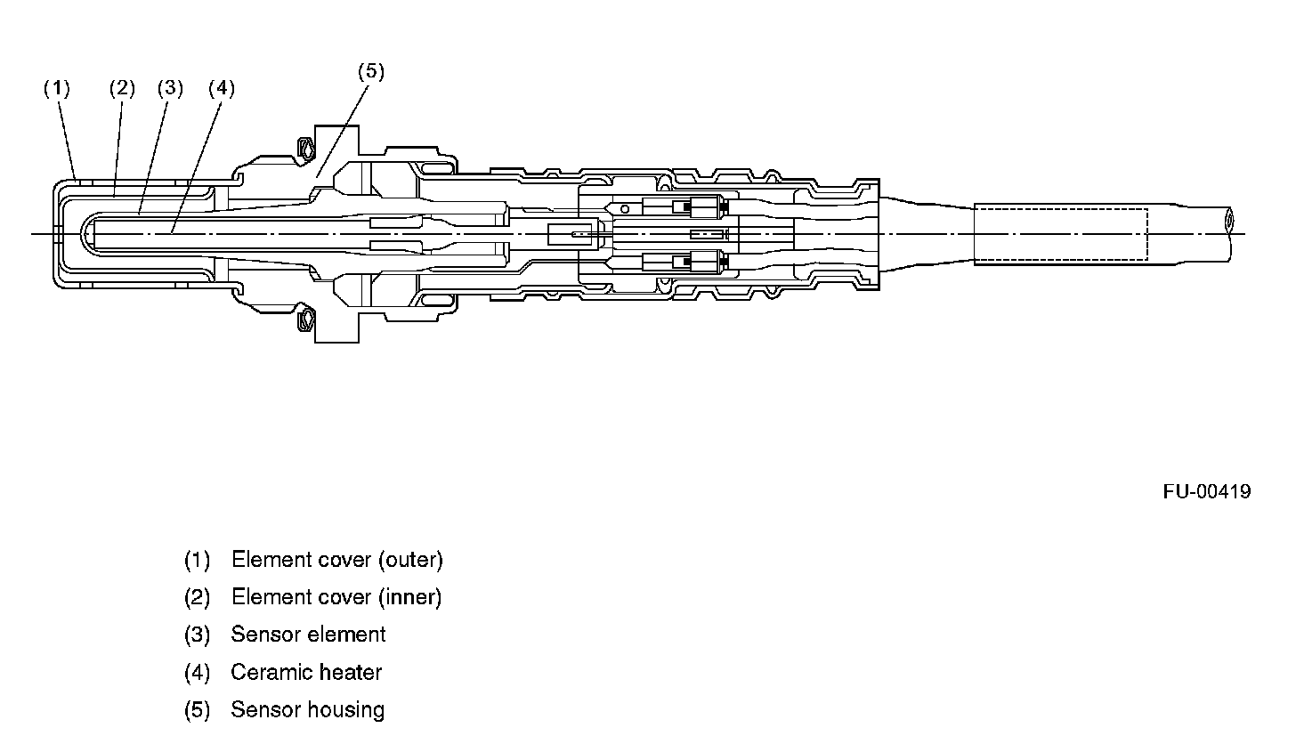 - The zirconium oxide material is formed into a closed end tube and its external surface is exposed to exhaust gases with smaller oxygen ion concentration, whereas its internal surface is exposed to atmospheric air. The external surface has a porous platinum coating. The sensor housing is grounded to the exhaust pipe and the inside is connected to the ECM through the harness to be able to use the current output from the sensor.