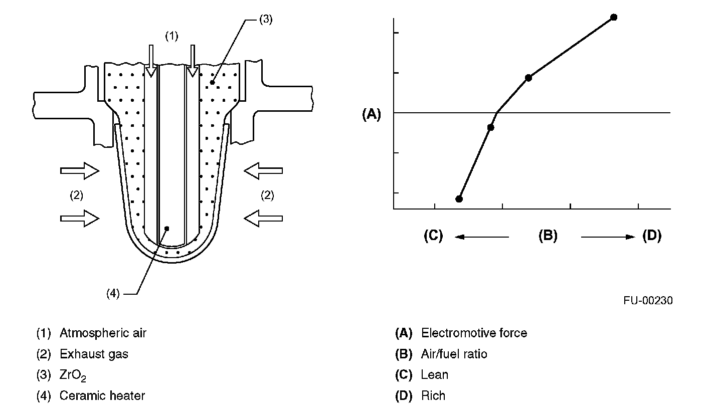 - When a lean air-fuel mixture is burnt in the cylinder, relatively large amount of oxygen remains in the exhaust gases even after the catalytic action, and this results in a small difference in the oxygen ion concentration between the tube's internal and external surfaces. The electromotive force in this case is very small.