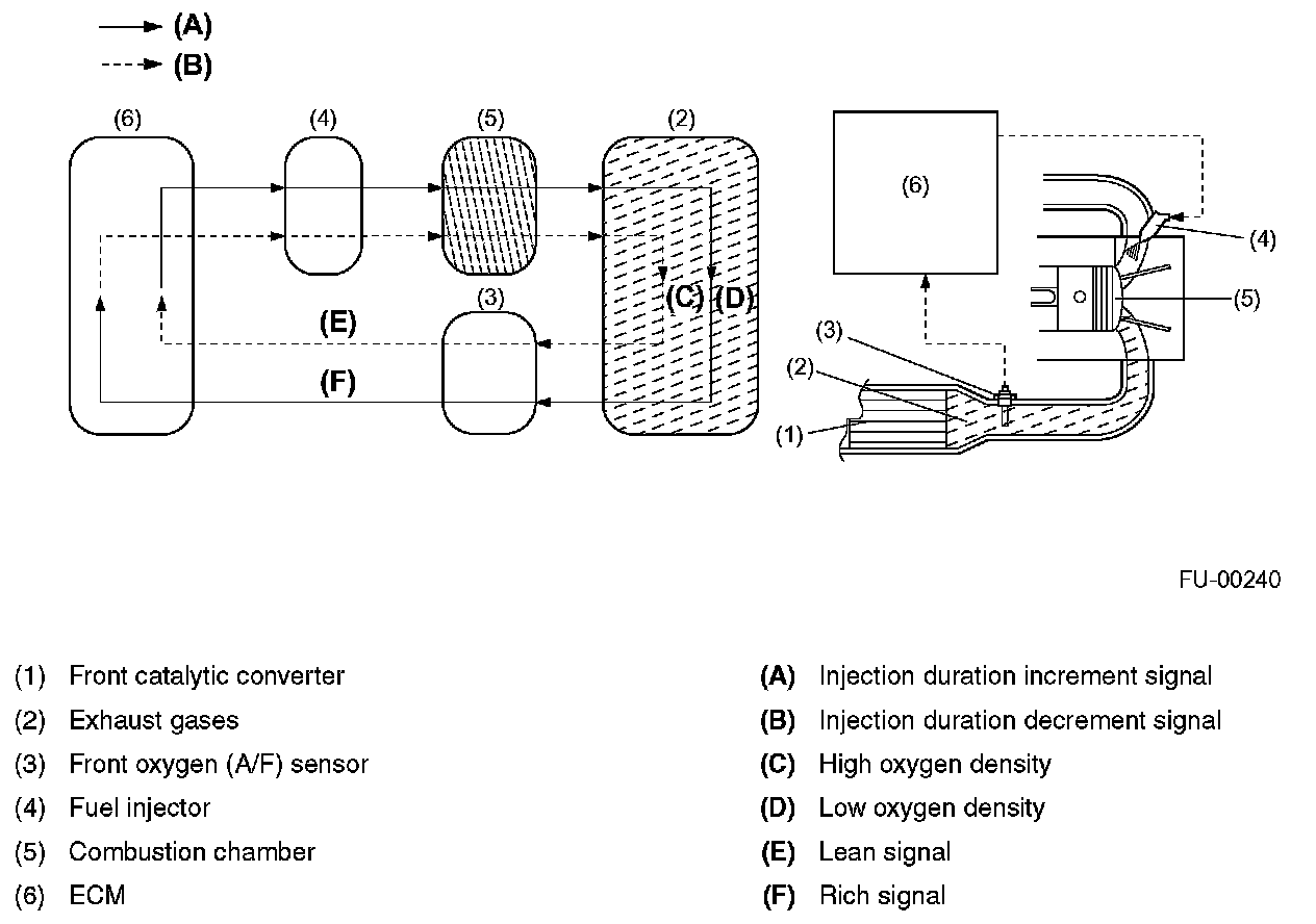 - In the air-fuel ratio feedback control, the ECM calculates the necessary amount of correction based on data from the oxygen sensor and adds the result to the basic duration (which is stored in the ECM's memory for each condition defined by the engine speed and various loads.)
