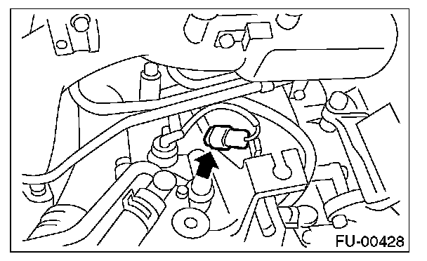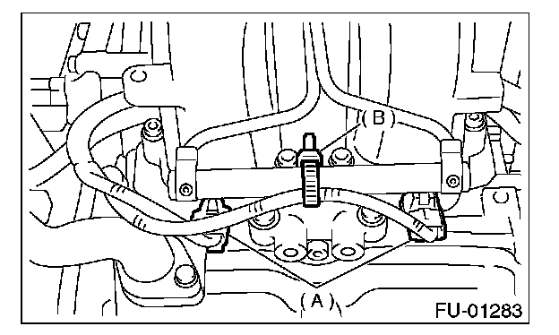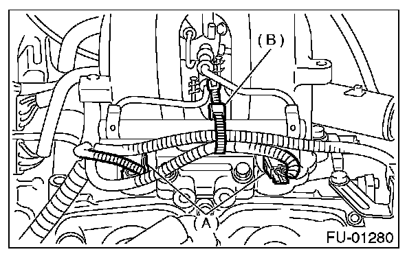 9. Remove harness band (B) which holds engine harness onto injector pipe.