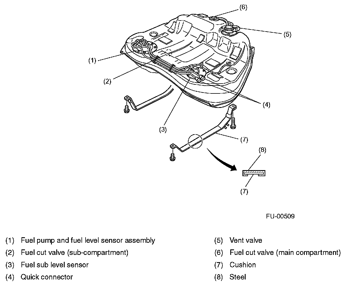 FUEL TANKThe fuel tank utilizes a two-compartment design to ensure sufficient capacity without interfering with the rear differential. It is provided with a suction jet pump (included in the fuel pump and fuel level sensor assembly) which transfers fuel from one compartment to the other. Each compartment has an individual fuel level sensor.