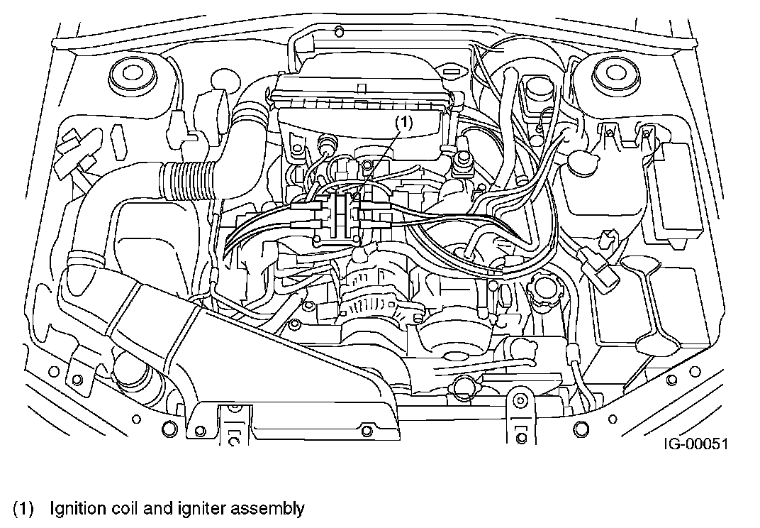 Ignition CoilIgnition coils are made integral with an igniter. The ignition system is of a dual-ignition-coil design, each coil causing two plugs to generate sparks simultaneously. In response to the signal from the ECM, the ignitor supplies current to an ignition coil and the ignition coil supplies high-voltage current to a pair of spark plugs (#1 and #2 or #3 and #4) simultaneously.