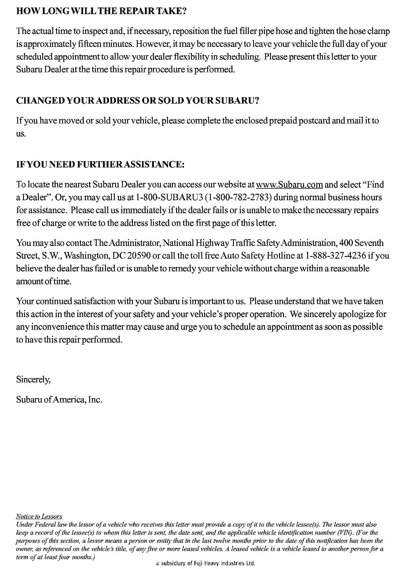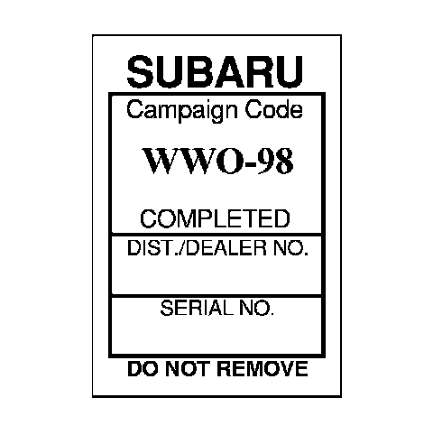 Any Authorized Subaru Dealer failing to perform the applicable service procedures defined in this bulletin to correct all affected vehicles in their inventory (new, used, demo) prior to the vehicle being placed in service may be subject to civil penalties of up to $5,000 per violation (i.e., for each vehicle), as provided in 49 USC sub-section 30165(a) of the Safety Act, and will also be in breach of the Subaru Dealer Agreement.