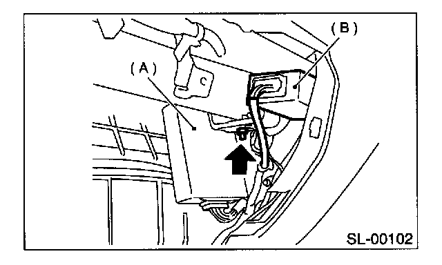3. Remove nut, then remove keyless entry control module (B) and the other electrical control module (A) while disconnecting connector.