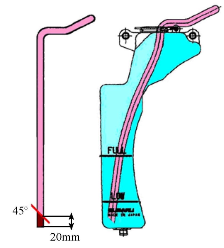 Remove the hose from the reservoir tank. Cut 20 mm from the bottom of the hose at a 45° angle. Reinstall hose in reservoir tank.
