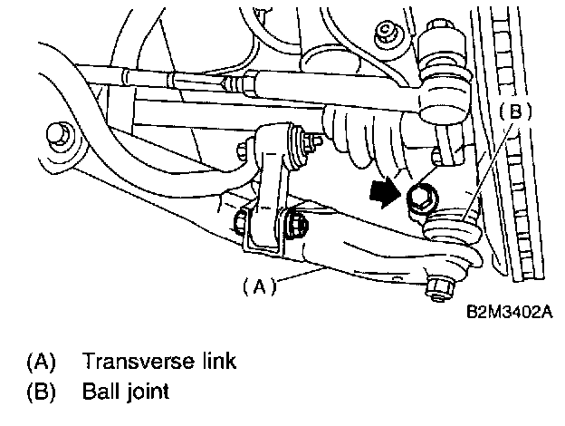 22. Remove bolt securing ball joint of transverse link to housing and separate ball joint and transverse link.