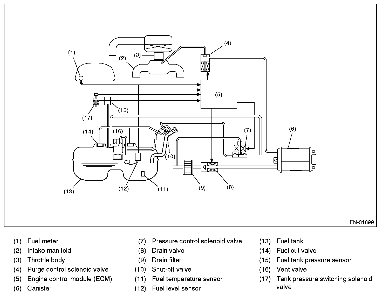 Fuel system is diagnosed by comparing the target air fuel ratio calculated by ECM with the actual air fuel ratio measured by sensor.