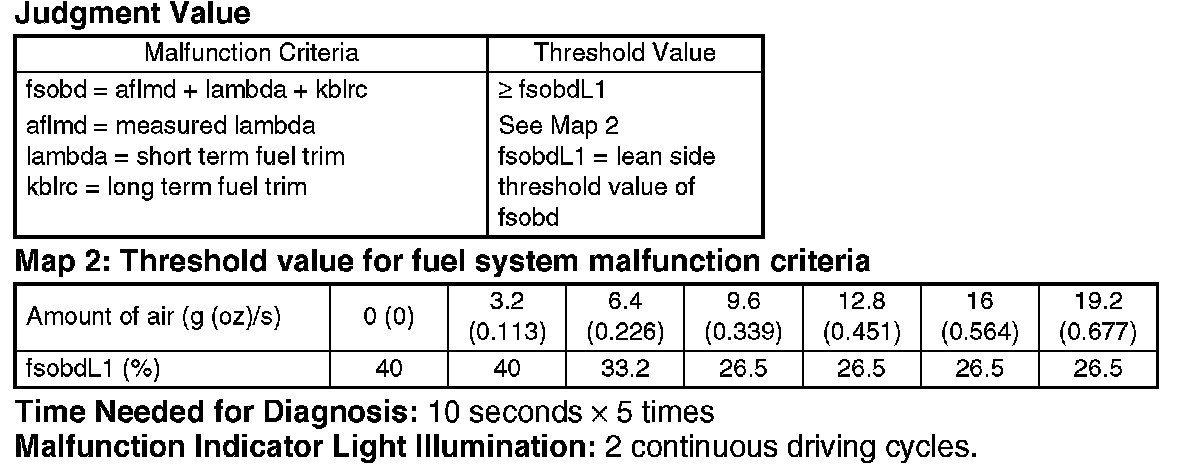 Judge that the malfunction occurred in fuel system when the malfunction criteria are completed for 50 seconds or more by comparing the diagnostic value (fsobd) with threshold value.