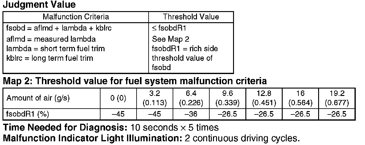 Judge that the malfunction occurred in fuel system when the malfunction criteria are completed for 50 seconds or more by comparing the diagnostic value (fsobd) with threshold value.