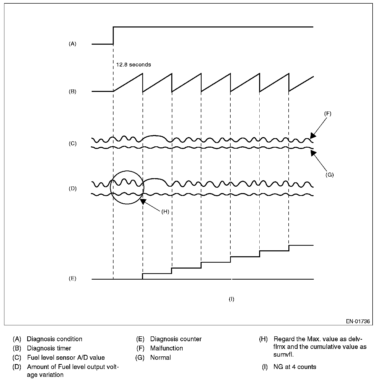 Calculate the max. value of the amount of output voltage variation from fuel level sensor and cumulative value during 12.8 seconds. Comparing the max value and cumulative value with the threshold value, and judge OK when the both do not go over the threshold value. Otherwise, when one of them goes over the threshold, count the counter up. Judge the ECM is troubled when the counter increased 4 times in a row.