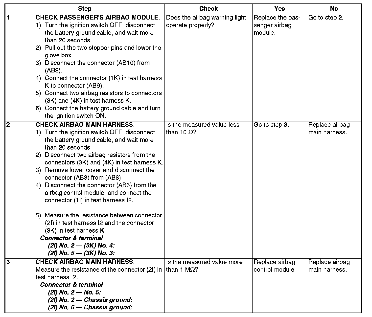- Airbag main harness circuit is open, shorted or shorted to ground.