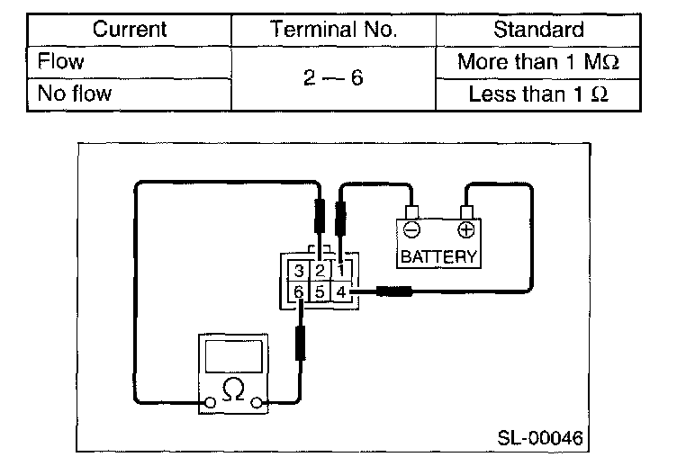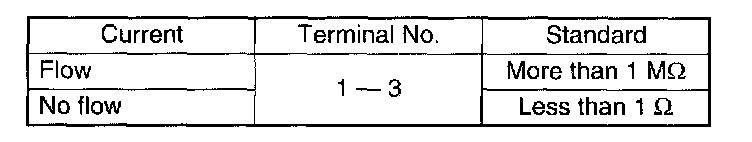 Measure the interrupt relay resistance between terminals (indicated in the table) when connecting terminal No. 1 (without OnStar (R)) or No 4 (with OnStar (R)) to battery positive terminal and terminal No 4 (without OnStar (R)) or No 2 (with OnStar (R)) to battery ground terminal