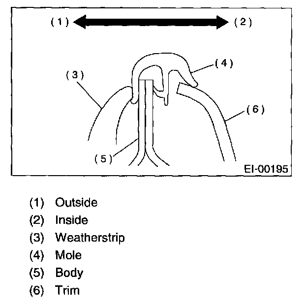 NOTE: When installing center pillar upper trim and front pillar upper trim, be sure to set front mole as shown in figure.