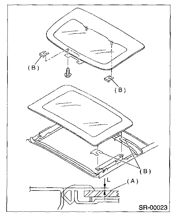 Loosen sunroof lid installation nuts and then adjust height by adding (max: two pieces) or extracting (max: one piece) shims (B) (standard: one piece) between sunroof lid (A) and body.